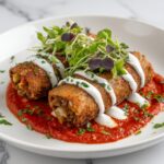 A crispy and cheesy twist on classic lasagna, this Air Fryer Lasagna Fritta recipe features rolled lasagna noodles filled with a rich blend of ricotta, Parmesan, Romano, Asiago, and mozzarella cheeses, seasoned with Italian herbs. The rolls are breaded, air fried to golden perfection, and served with homemade Alfredo and marinara sauces for a deliciously indulgent appetizer or main dish.