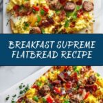 A delicious and hearty Breakfast Supreme Flatbread featuring a crispy artisan flatbread base layered with creamy garlic and herb cheese, scrambled eggs, a savory blend of breakfast and smoked sausages, bacon, sautéed onions, bell peppers, and melted mozzarella cheese, perfect for a satisfying morning meal.