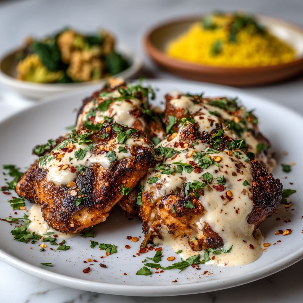 Once baked, sprinkle freshly chopped parsley over the chicken for a pop of color and a hint of fresh herbaceous brightness that perfectly balances the richness of the sauce.