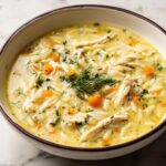 This Greek Lemon Chicken Soup, also known as Avgolemono, is a comforting and tangy soup made with chicken broth, fresh lemon juice, vegetables, orzo pasta, and tender shredded chicken. The soup is enriched with a silky egg-lemon mixture that adds richness and a bright, zesty flavor. Perfect for a nourishing meal that’s light yet satisfying, this traditional Greek recipe is easy to prepare and serves six.