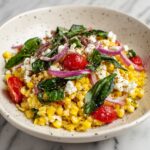 This vibrant Grilled Corn Salad is a fresh and flavorful side dish perfect for warm weather meals. Featuring sweet and smoky grilled corn combined with juicy grape tomatoes, crisp red onion, fragrant basil, and creamy feta, all tossed in a simple olive oil and white wine vinegar dressing, this salad offers a delightful blend of textures and tastes in just 20 minutes.