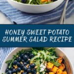 This Honey Sweet Potato Summer Salad is a vibrant, flavorful dish perfect for warm weather. It features roasted sweet potatoes seasoned with thyme and pepper, paired with fresh arugula, juicy blueberries, creamy goat cheese, and crunchy pepitas and pine nuts. A tangy honey lemon vinaigrette ties all the flavors together, offering a delicious balance of sweet, tart, and savory notes. Served warm, this salad is a delightful and nutritious option for a light meal or side dish.