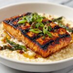 For a restaurant-worthy touch, serve the risotto in deep bowls with the salmon on top, resting on a slight bed of microgreens or edible flowers for color and presentation flair. Drizzle a little toasted sesame oil around the plate for aroma and visual appeal. It’s all about making the experience feel special and inviting.
