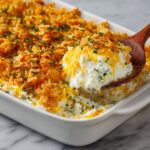 Million Dollar Potato Casserole is a rich and creamy baked side dish featuring shredded hash browns combined with cream cheese, cottage cheese, sour cream, cheddar cheese, and a crunchy buttery Ritz cracker topping. Perfect for holiday dinners or family gatherings, this comforting casserole is bubbly, cheesy, and irresistibly delicious.