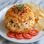 Once chilled and firm, unwrap your cheese ball and roll it in crushed tortilla chips. The chips create a crispy outer layer that’s irresistible, giving a perfect contrast to the soft, luscious center. Gently press any leftover chips on top to finish the look and texture.